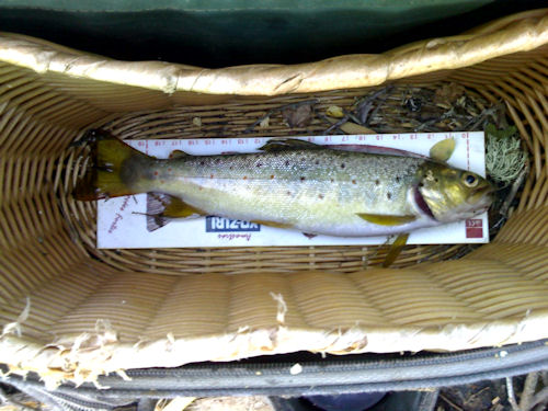 Os primeiros lançamentos sairam no troço imediatamente a montante da Ponte de Anhel, mas nada picou. Vi algumas pequenas trutas atrás da colher, mas notou-se que aquelas já tinham visto a sua quota de pescadores. Lentamente, fui-me deslocando para montante e começaram a surgir os primeiros sinais de actividade. Levei um toque de uma boa truta à saída de uma pequena corrente e comecei a vê-las a correr com força atrás da amostra. Numa entrada de um pequeno rego de água no Neiva, vejo a primeira boa truta com cerca de 29 cm. Em vez de atacar, fugiu da amostra.